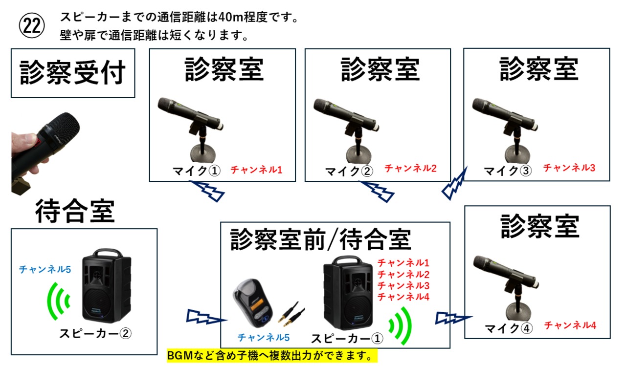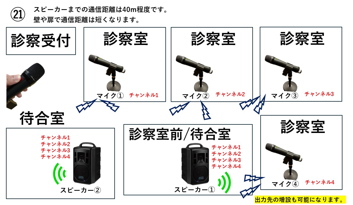 通信距離内であればスピーカーを増やすことで出力の増設ができます。