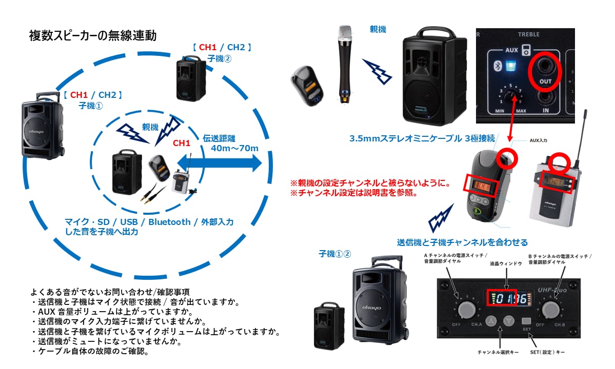 ・ワイヤレスマイク2本 + 有線マイク2本の4本同時出力。