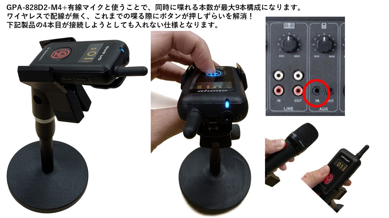 ・ワイヤレスマイク2本 + 有線マイク2本の4本同時出力。